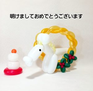 バルーンアートでお正月の定番でもある鏡餅、しめ縄、そして白馬を作りました。